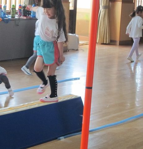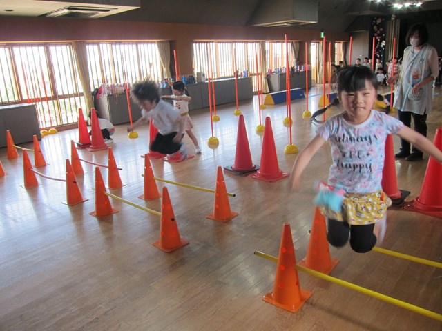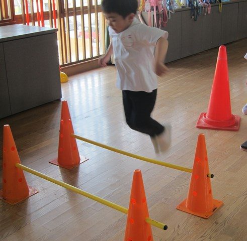 2台のハードルのジャンプは、リズムよく!こちらは、太股が胸やお腹につくぐらい、しっかり上げることが大事。これが結構むずかしい。。。これから練習していこうね!