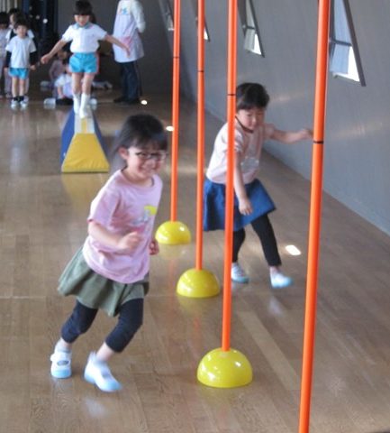 ジグザグ移動の時には、棒を素早くよけながら、早く走るコツとして、新しい動きを教えてもらったみんな。さらに、しっかり前を見て進むとあっという間にクリア出来ましたよ。