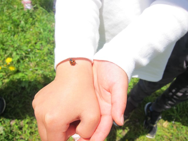 いつも幼稚園の『アニマルランド』で、じーっとテントウムシやカメを見ている女の子が、勇気を出してテントウムシを捕まえた場面。「かわいい!」ととっても嬉しそうなお顔でテントウムシと遊んでいましたよ。