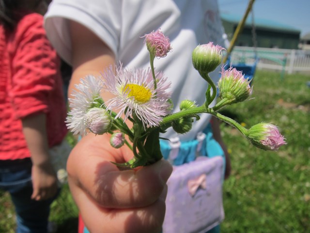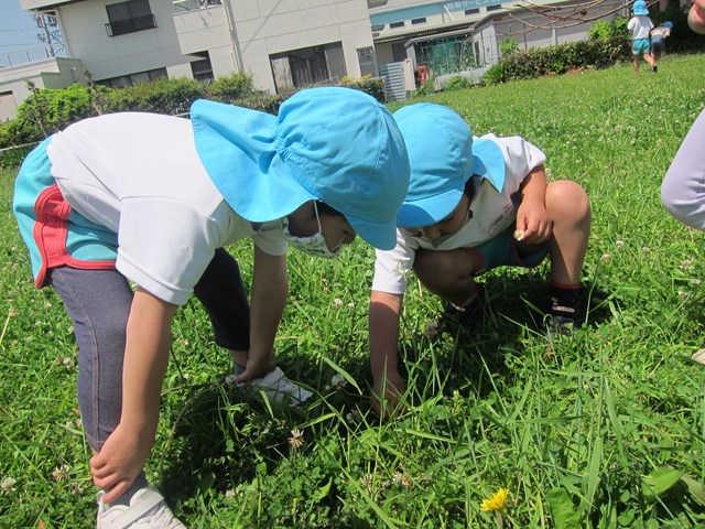 「幼稚園には無い、草やお花を見つけたら、おしえてね!」と声をかけると、草花見つけに夢中になっている子も。「せんせい、綿毛みつけた!」「シロツメクサだよ。」と大切そうに見せてくれました。
