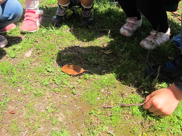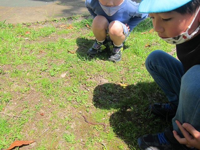 こちらは、なが~いみみずを発見!「どこからきたのかな?」「みみずは土の中にいるはずなのに。」「死んじゃうよ。」と子ども達は心配そうに見ていました。