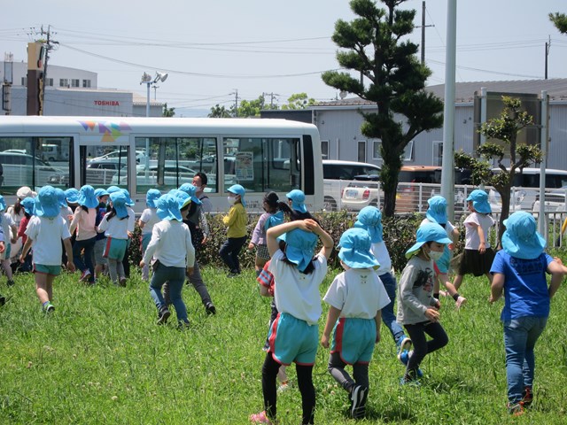 クラスで1個ずつ虫かごを持って、今回は、虫が大好きな原っぱが広がる「宇佐南公園」にレッツゴー✊(近い公園ではありますが、安全確保のため、バスに乗っていきます。)