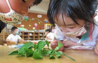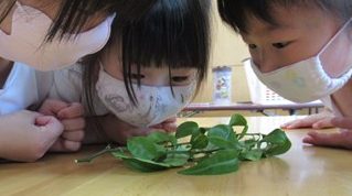 今朝、園長先生が子ども達に持って来て下さったミカンの若い葉。そこには、小さな小さな黄色い卵がくっついていました。「ここに卵があったよ!」と間近でアゲハチョウの卵を見て確認してきた子ども達。