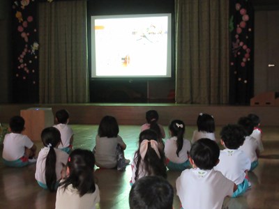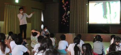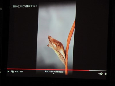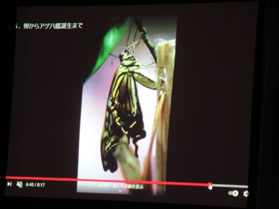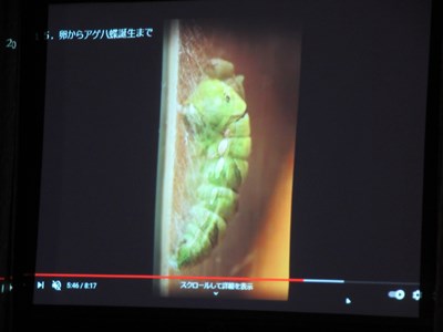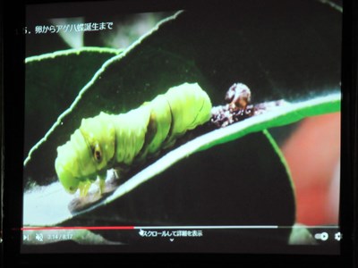 そして、大きなスクリーンに卵がうつり、中から幼虫が出てくると「この幼虫が最初に食べるのは何だと思う?・・・そう、自分の卵の殻を食べるんだよ。」子ども達は、びっくりして食い入るように映像を見つめていましたよ。