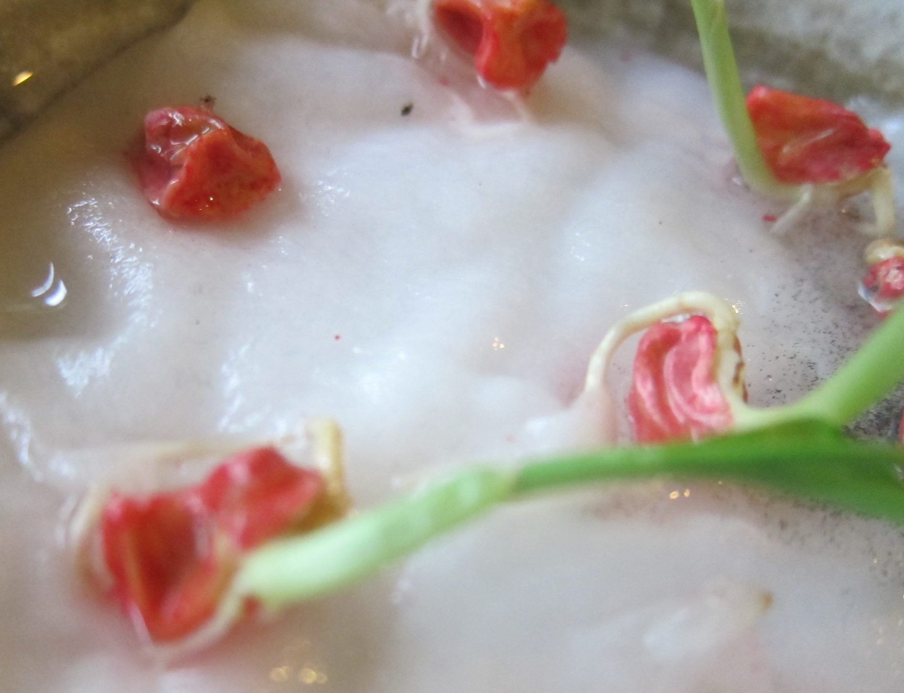 その後、先生はこんなピンク色の種も持ってきてくれました。これは、トウモロコシの種なんですよ。こちらもしっかり根っこを張って芽が伸び出しました。