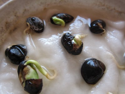 さこだ先生が「子ども達に見せてあげたら楽しいかな。」と、7つの黒豆を水に浸した綿の上に並べて、そっと教務課の前に置いてみました。(4月20日の記事「大人気!アニマルランド」)