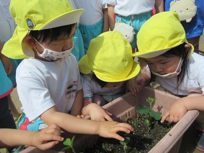 黒豆はぐんぐん大きくなって小さいプランターが窮屈そう。大きめのプランターに植え替えることに。そこで、まずは年中組の子ども達を誘ってみると、「やるやる!!」とみんなが駆けてきましたよ。