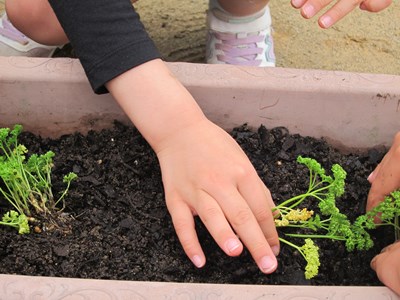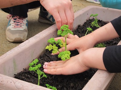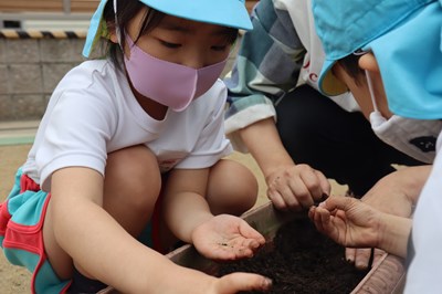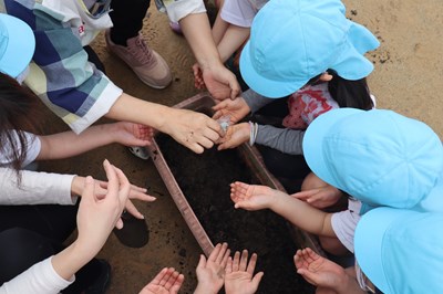 緑色の小さな種を、あったかい手のひらで包んで、一粒ずつ植える子ども達。