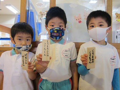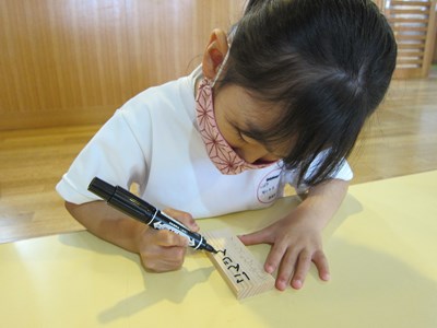 名前を付けてあげることも今の若葉第三幼稚園のブームになっています♪ 先生と一緒に、かまぼこの板にそれぞれの野菜の『名札』を書いてくれた年長組さん。