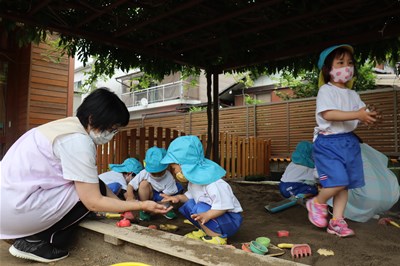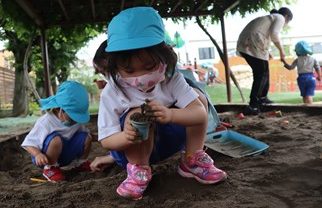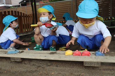 大人からみると小さな砂場も、子ども達にとっては、広くておもしろいパラダイス!アンパンマンの砂型を持って、なんども型抜きをしている子ども達。「あんぱんまん、できた!」とうれしそうに見せてくれましたよ♪