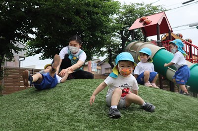 「お山をころがってみようかな・・・」何度も先生のお顔をみて、なかなか離れられない子もいるけれど、これから少しずつ色んなことが出来るようになるから、だいじょうぶだよ😊
