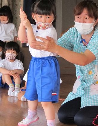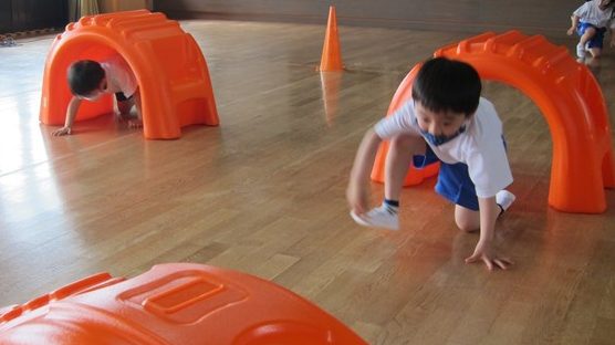 「『くぐる』っていうのは、キュッと小さくなってぶつからないように通り抜けることだよね、みんな、できそうかな?」となつみ先生。「できる、できる~!!」