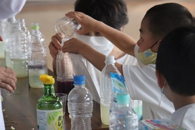 「さあ、みんなの魔法の力をかしてね!」まっきー先生の声に、子ども達は、みんなでペットボトルを指さしてぐるぐる~っと回してピピッ!「あ、魔法がかかったみたいだよ!」