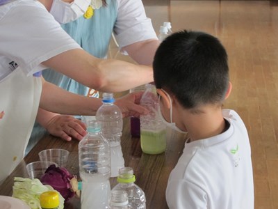 アシスタントのまさこ先生がジューサーにかけると、キャベツがジュースに変身し、「緑色になった!」「わ~きれいな紫色!」