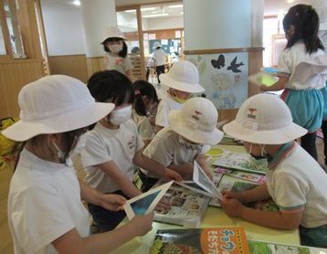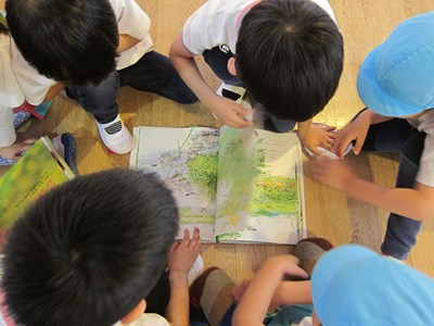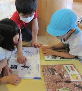 年長組の廊下は、いつもに増してワイワイガヤガヤ。そして、たくさんの本や図鑑がずらり。それらを友達と一緒に夢中で見ながら・・・みんなの心の『虫探しスイッチ』ON!