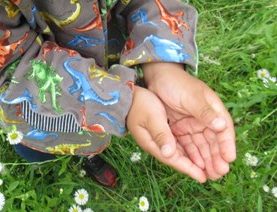 やっと見つけたテントウムシが逃げないように、そっと手の平をひろげて見せてくれました。