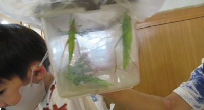 今回は、ショウリョウバッタが2匹もGETできたね。ぴょんぴょん逃げていくから、子ども達は一生懸命追いかけて取ったそうですよ。