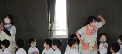 以前、年少組では『忍者!くぐるの巻』をご紹介しました。かおり先生によると、いまも「修行中」のちびっこ忍者たちは、「にん!」と言うと、一斉に静かになるそうです😊
