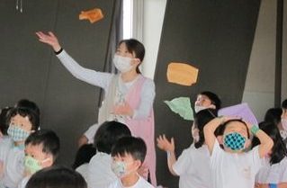 さやか先生が、♪『忍者って何じゃもんじゃ』の歌に合わせて、あたま手裏剣や足手裏剣を乱れ打ち!