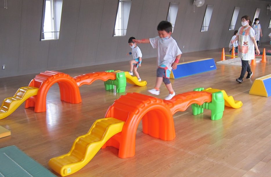 平均台では「ちょっと怖いな~」と恐る恐る渡っていたけれど「手を広げながらバランスを取ってごらん!」のアドバイスに、「あ、できた!」あきらめないで渡っていくみんな。