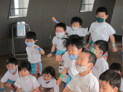 さっとしゃがんだり、ジャンプしてよけたりを、すばやいテンポで挑戦しながら、みんなで楽しく踊っていた子ども達。