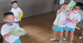 ふわふわのカラフルなお花紙をヒラヒラと上に投げてキャッチする修行。「きゃー!落ちちゃうよ」「片手でとれたよ!」紙を追いかけながら何度も挑戦!一斉にふわっと浮かぶ虹のようなお花紙がとってもきれい。オシャレな修行を楽しみました。