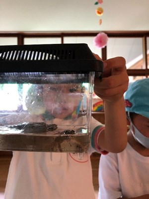 一つ目の宝物は、可愛い目をした二匹のアマガエルでした。虫かごには、カエルが生息しやすいように水場と石で作った陸地があり、ご飯となる小さなバッタもいました。生き物に興味を持ち、生態を知り、飼育することで、命の不思議や尊さを学ぶきっかけに繋がると嬉しいですが、私がそうだったように、今はただ自分で生き物を捕まえ、飼育し、小さな命と触れ合う喜びを感じ、知的好奇心をどんどん膨らませて欲しいなと思います。それにしても立派な大きさのアマガエルでびっくり。