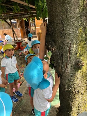 じっくり観察した後は、みんなでセミを逃がしてあげることに。もう捕まらないようにと、できるだけ木の高いところに逃がしてあげたいと思いついた優しい子どもたちでした。必死で背伸びをして高い幹に逃がそうとする姿が可愛かったです。