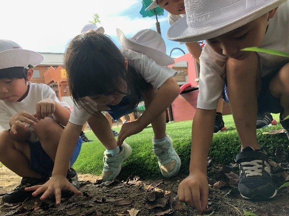 木の下のプランターをひっくり返してダンゴムシを探していると、他の子どもたちも寄ってきて、一緒になって探してくれました。ふとしたことがきっかけで子どもたちの輪は広がっていきます。