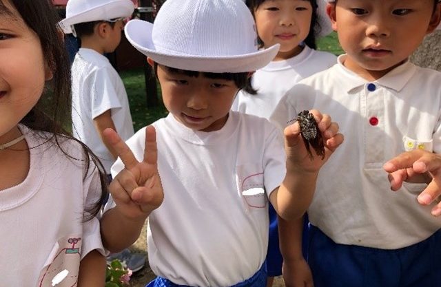 ザリガニの雄と雌の違いを見比べたり(生きているザリガニと図鑑のザリガニを並べて検証しました。ザリガニの水が臭い~と鼻をつまむ子もいましたが、これも一つの経験となりました。ハサミの大きさと、お腹の機能に違いがあるんです)、カタツムリを捕まえようとする年少さんが、床にへばりつくカタツムリのねばねばの粘液に悪戦苦闘したり、捕まえてきたセミの名前を図鑑で調べ、「鳴かないからこの子はメスだね」なんてマメ知識が飛び出したり、セミは一週間しか外で生きられないから逃がしてあげようと子どもたちの判断で、元居た木の幹に逃がしてあげたり…子どもたちの興味や好奇心で活動がどんどん広がっていきます。子どもたちのたくましさや優しさに感心させられることばかりです。