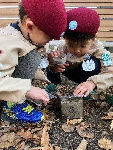 虫が大好きな年少の男の子二人組。お外遊びが始まると、虫かご片手に植木鉢の下を覗いたり、りんごの木の下の落ち葉をかき分けたり…